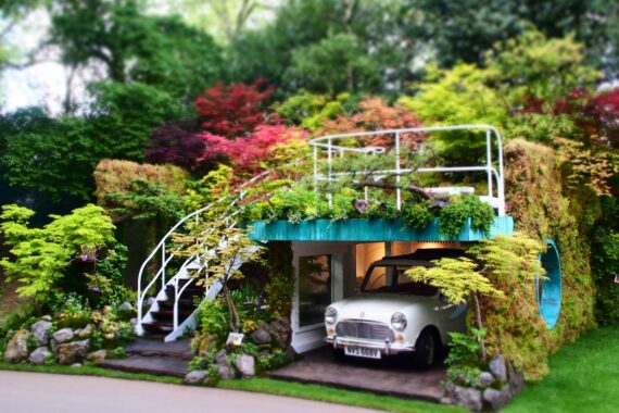 ガレージと日本庭園の融合